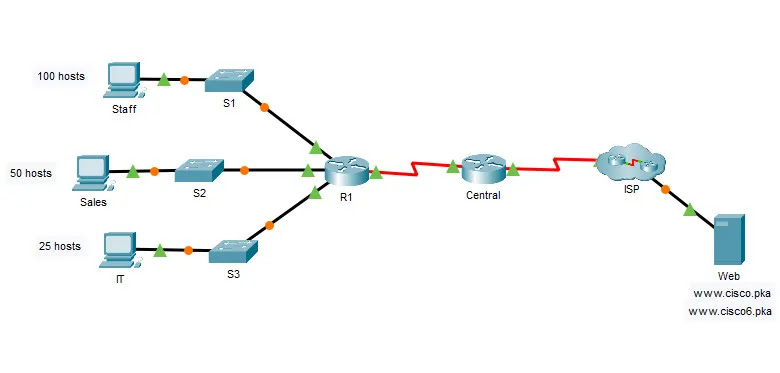 The router Central, ISP cluster, and the Web server are completely configured. You must create a new IPv4 addressing scheme that will accommodate 4 subnets using the 192.168.0.0/24 network. The IT department requires 25 hosts. The Sales department needs 50 hosts. The subnet for the rest of the staff requires 100 hosts. A Guest subnet will be added in the future to accommodate 25 hosts. You must also finish the basic security settings and interface configurations on R1. Then, you will configure the SVI interface and basic security settings on switches S1, S2, and S3.